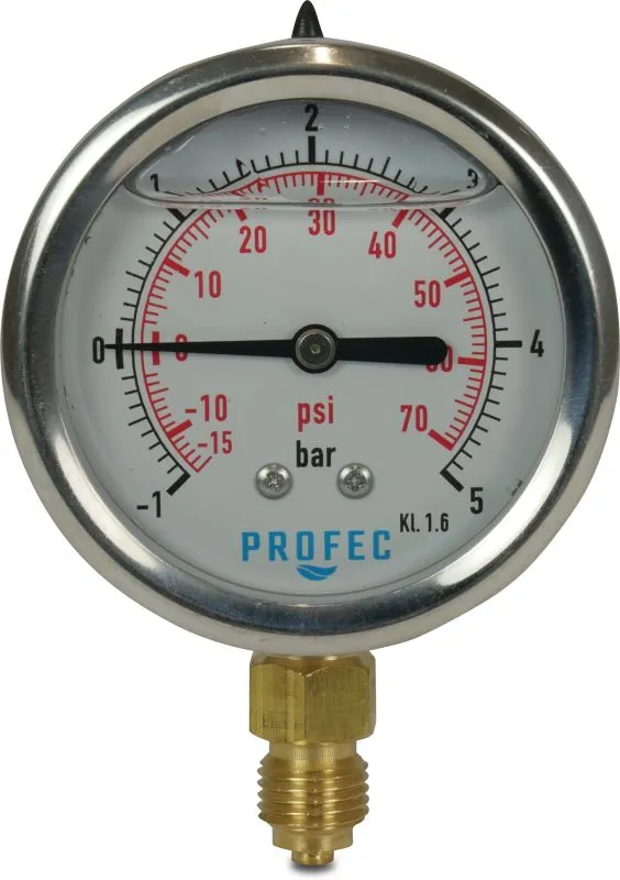 The Profec Pressure Gauge (Glycerin Filled, Male Thread) is a reliable instrument for monitoring pressure in fluid and air systems. Featuring a clear dial housed in a durable case with a male threaded connection, this gauge uses a glycerin-filled mechanism to help steady the movement of the needle and improve performance in environments with vibration or pulsation. Built to provide accurate pressure readings and long-lasting service, it’s suitable for use in plumbing, irrigation, pump systems, compressors and general pressure-measuring applications where dependable monitoring is essential.