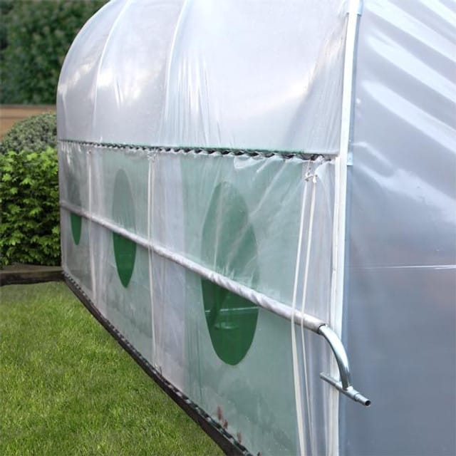 This simple to operate, low-cost ventilation system offers a practical solution during the summer months, especially for longer polytunnels where stale, humid air can build up in the centre of your polytunnel. Simply wind up the polythene side screen/s when required, and wind down when you want to retain the heat. Can be fitted to one or both sides of your polytunnel. Kit includes aluminium side rail, external polythene wind-up screen, and netting (to cover the ventilation holes). The holes are cut in to the main cover once the side rail has been attached. This kit can be fitted to existing polytunnels.